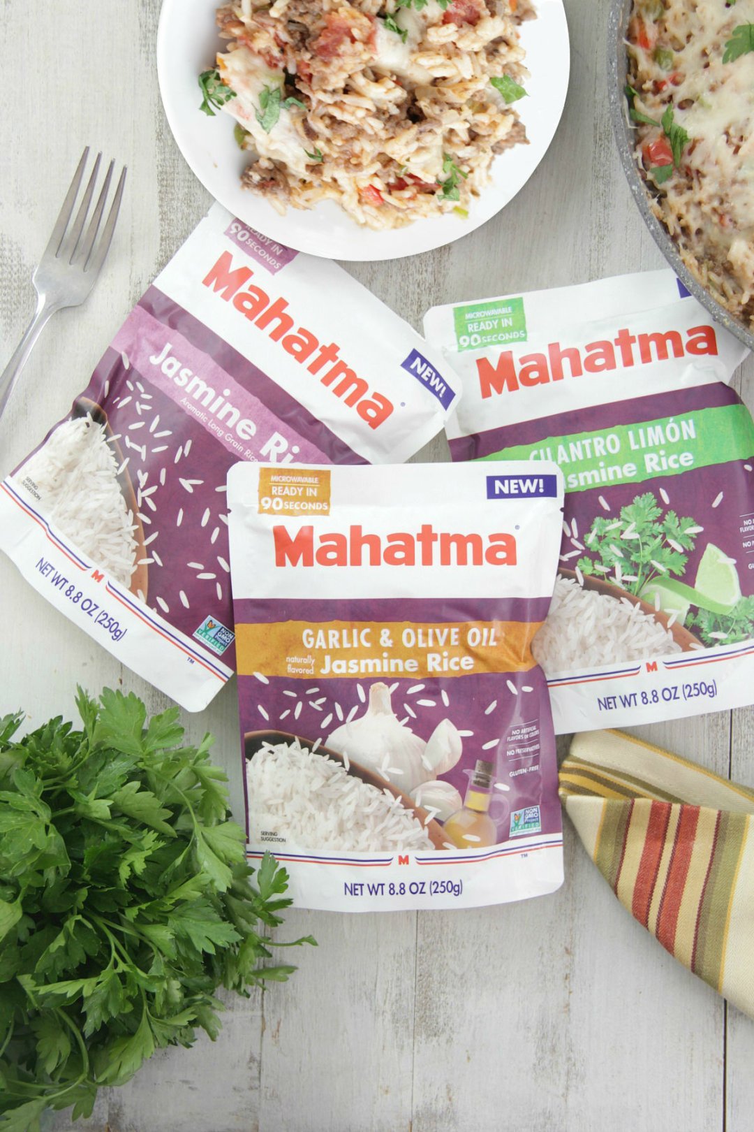 I was recently asked to create an easy and nutritious weeknight meal with the new Mahatma® Ready to Serve Rice! I’ve been a fan of Mahatma® for many years now and I love that its made right here in the USA. The Mahatma® Ready to Serve Rice comes in three varieties including Garlic and Olive Oil, Cilantro Lime, and Jasmine Rice and they are all Non-GMO. The best part about these is that you don’t have to worry about boiling water or sticky rice (a common issue I often have when cooking rice). All you have to do is serve the pouches according to the microwave instructions on the packaging and the rice is ready to go in just 90 seconds!